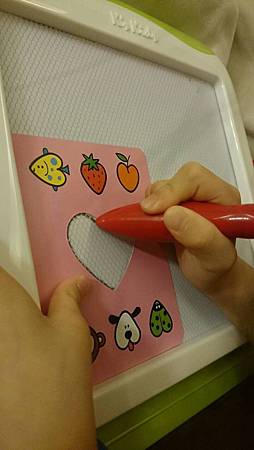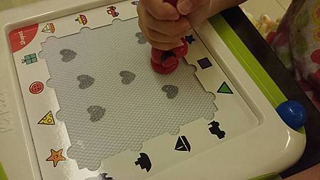 這套魔法畫家學習組,除了有一塊磁鐵塗鴉畫具,最特別的就是,還附了12張24種活動學習卡、12張144種形狀學習卡,以及一本20頁的塗鴉畫冊。先來看這塊磁鐵版,四角的形狀都是圓的,非常安全,再配上一支小狗造型的胖胖筆,不僅吸睛,握起來時也很好使力。如果把小狗比倒過來用,就變成愛心圖案的印章,又多了一種玩法。最重要的是,這塊板子很好「ㄌㄨ」,在去除磁鐵畫痕的時候,小朋友非常好施力,就能「ㄌㄨ」得乾乾淨淨。